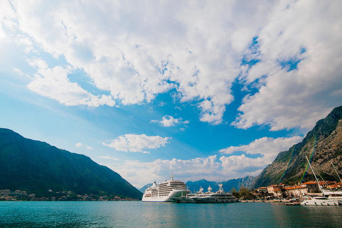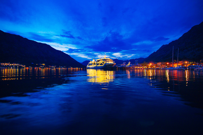 ↑ Лайнер, пришвартованный недалеко от стен старого города Котор. Лайнеры летом частые гости в Которе. В сезон их может 3-4 там быть. Один/два на причале и остальные по центру Боки стоят. Координаты: 42.424961, 18.768125