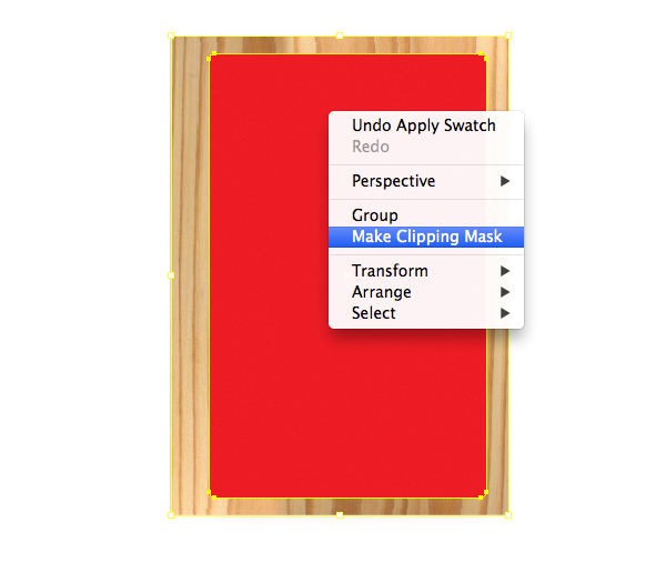 Поместите в документ текстуру дерева, которую можно скачать здесь. Возьмите копию прямоугольника, который мы создали в предыдущем шаге и поместите его над текстурой. Выделите текстуру и прямоугольник и в меню выберите Objects > Clipping Mask > Make(Объект>Обтравочная маска>Создать).