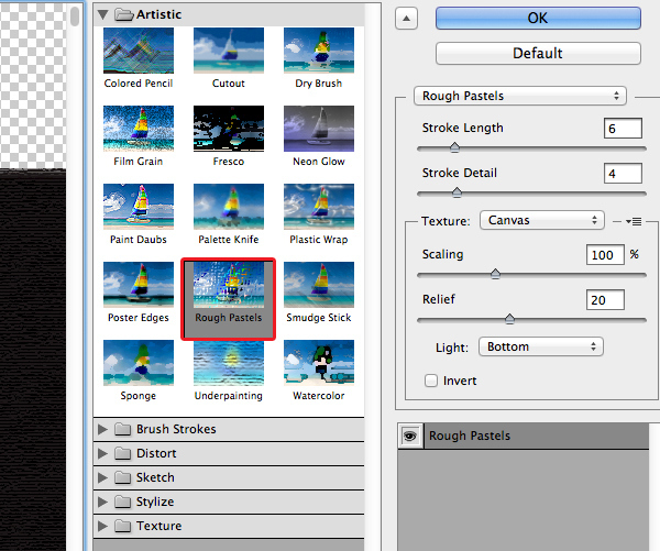 Выделите копию прямоугольника, разместите ее на переднем плане, затем в меню выберите Effect > Artistic > Rough Pastel(Эффект>Имитация>Пастель). Настройте эффект следующим образом: