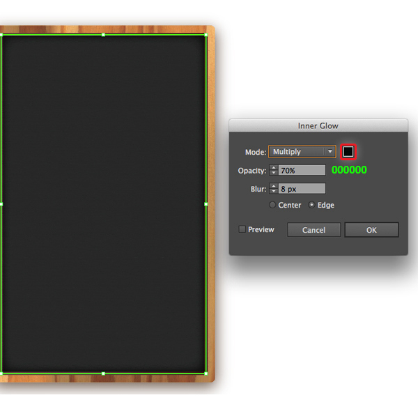 Укажите прямоугольнику с текстурой режим наложения Soft light/Мягкий свет и Opacity/Непрозрачность в 30%. Затем в меню выберите Effect > Stylize > Inner Glow(Эффект>Стилизация>Внутреннее свечение) и укажите настройки как показано ниже:
