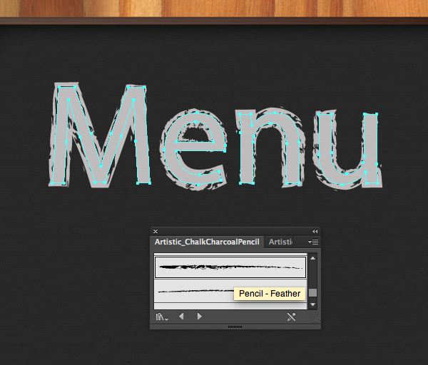 Откройте галерею кистей Artistic_ChalkcharcoalPencil (Уголь и мел) и примените к обводке кисть Pencil – Feather, убрав Opacity/Непрозрачность до 80%.