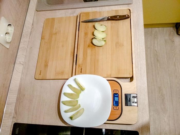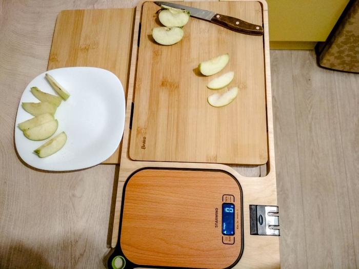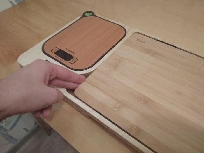 В органайзере совмещено четыре предмета - это две разделочные доски 340х240х10, кухонные весы до 5 кг и точилка для ножей с предварительной и финишной заточкой. Все элементы являются съемными и заменяемыми, в том числе и точилка.