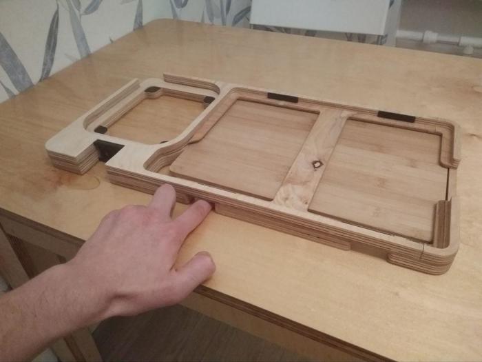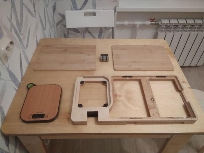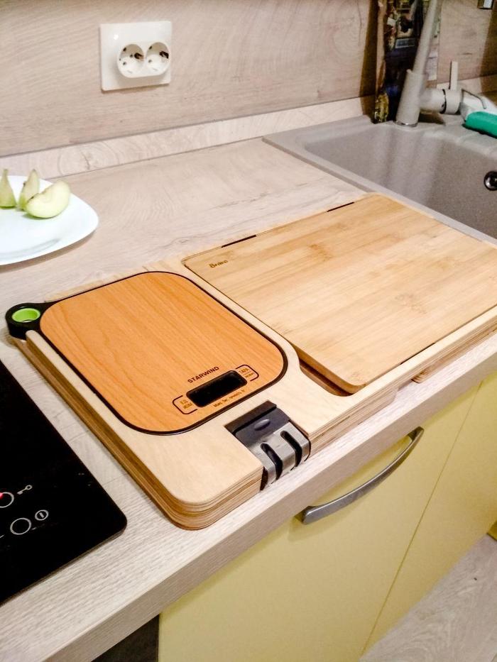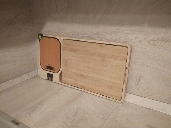 Мы живем в удивительное время, сейчас почти любой может создавать необычные вещи. Это связано с тем, что из-за высокой конкуренции подешевели услуги по чпу фрезеровке, лазерной резке, 3д печати, 3д моделированию, также на рынке появились доступные микроконтроллеры. Так что, имея идею, немного знаний и чуть-чуть денег, можно пытаться творить. В общем, я сделал органайзер для кухонной доски, т.к. могу себе это позволить). Буду признателен за взгляд со стороны, нужно это или нет, что добавить или вообще никому не показывать?