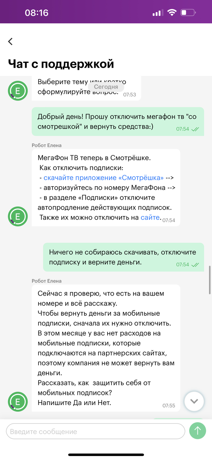 Сначала специалист врал, что у меня подключен до сих пор какой то пакет фильмов Мегафон ТВ, а Смотрешки это просто новое название, (хотя я вижу дату отключения всех пакетов в личном кабинете 9 августа) и где ж тогда списания с 21.09 по 16.10? Значит пакет давно отключен. Потом врал, что возврат невозможен, потом вообще покинул чат. Пост конечно , без морали, просто проверьте свой баланс.