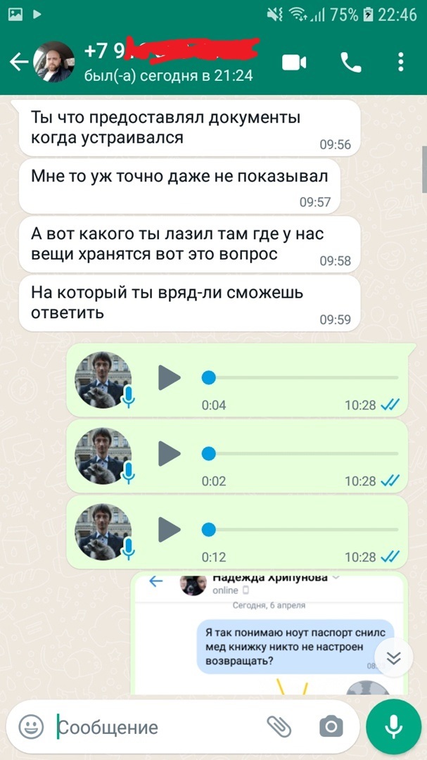 Последний мой диалог с мужем Хрипуновой в ватсапе: