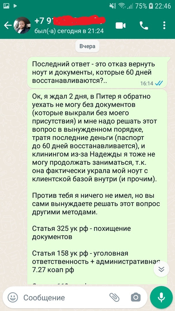 Реальность сейчас - ноутбука и документов до сих пор нет, плюс эта Надежда Хрипунова у себя в телеграм канале распространяет инфу, что это Я мошенник, который проникает в семьи, втирается в доверие и потом говорит про них гадости. И типа я этим занимаюсь с 2014 года.