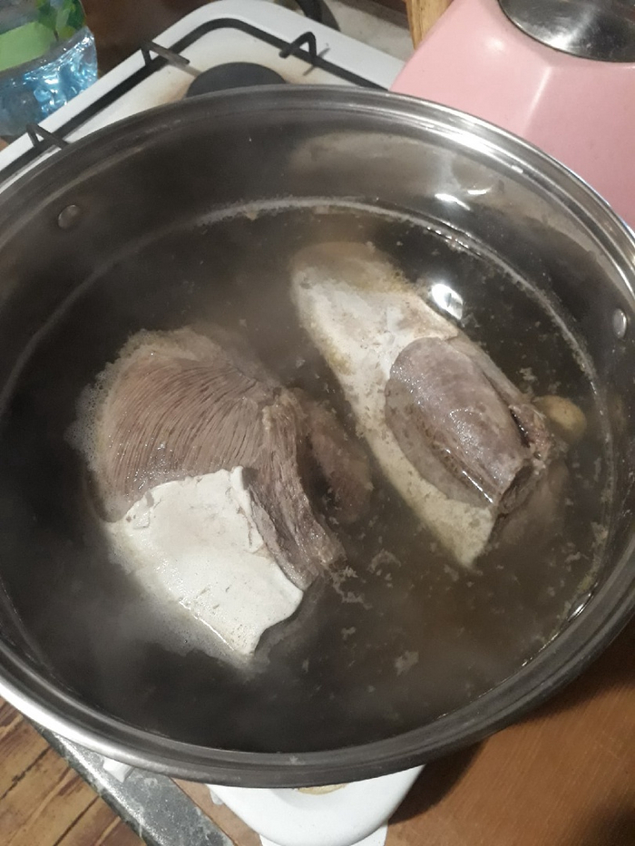 Кстати когда я этот язык варил — Таня (9 лет) зашла на кухню, понюхала, поморщилась, зажала нос и уходит такая в комнату и говорит — «Там так воняет, я сейчас чуть не упала от запаха...».
