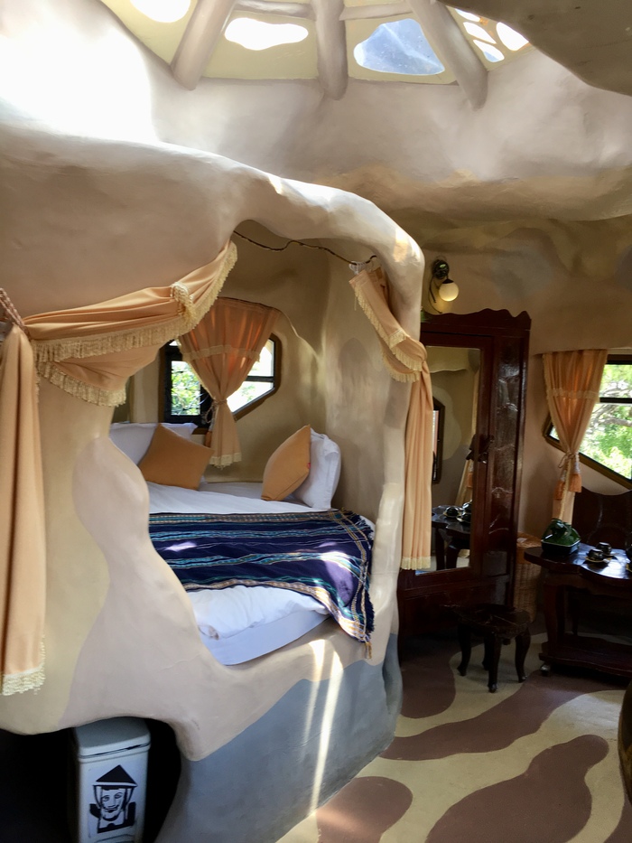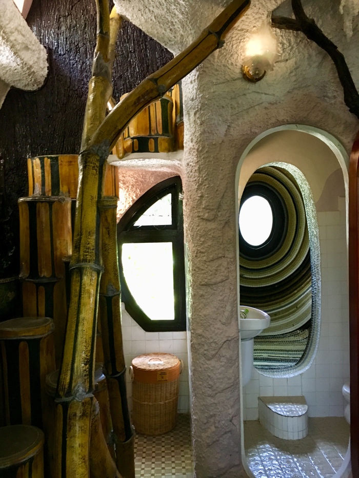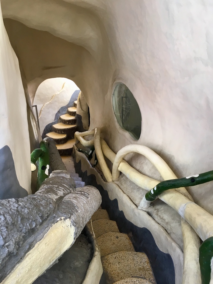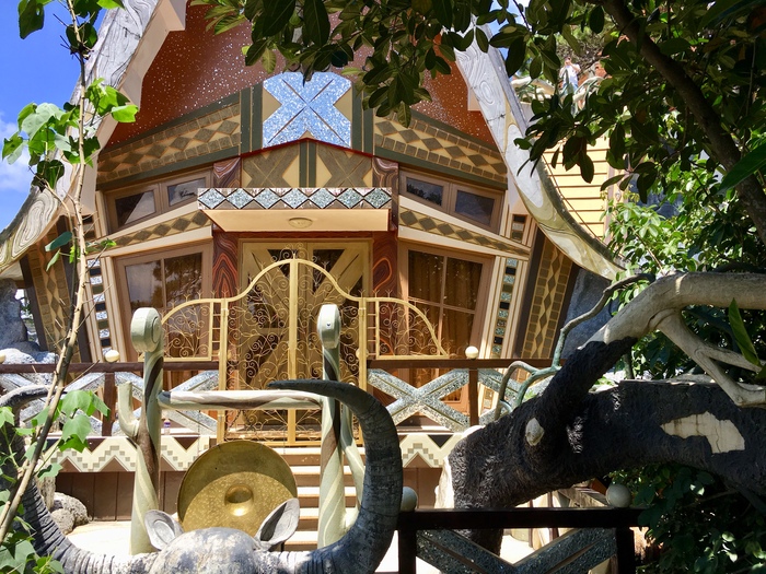 Весь его яркий внешний облик формируется благодаря битой керамике и цветному стеклу. В ход идёт всё: облицовочная плитка, посуда, бутылки, горшки, вазы — в общем, всё керамическое и стеклянное, что разбилось и пришло в негодность. Весь этот бой свозят со всей округи уже много-много лет и продолжают выкладывать разнообразные мозаики на стенах.