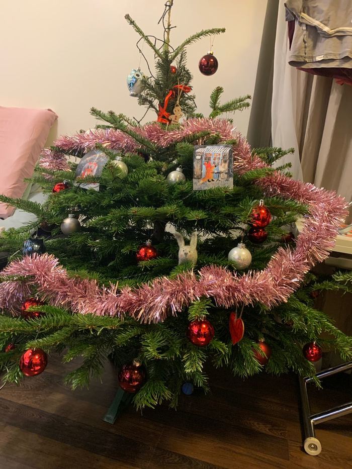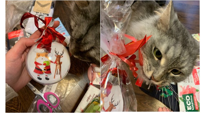 Смотрите, какой новогодний шар! Кот сходит с ума по ленточкам, поэтому пришлось отбирать