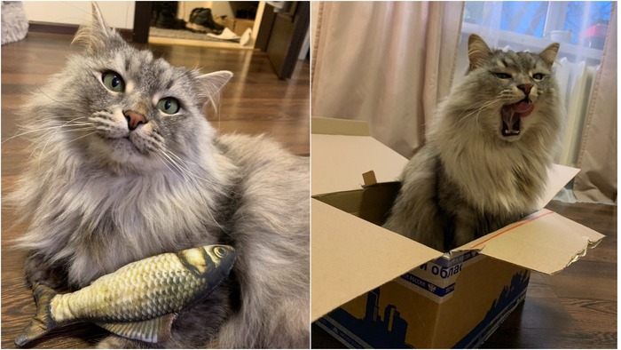 Коту традиционно досталась коробка, куда он и переехал вместе с рыбой
