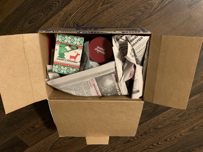 Ну и внутри было много всего, с учетом всех просьб и пожеланий (сказала что стараюсь не есть вредное и сильно сладкое и Снегурочка отправила полезные сладости; написала, что люблю всякие чаи и получила в подарок вкусный чайный набор - в общем все старательно подобрано и это очень приятно!)