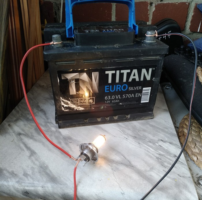 НО! Так как сопротивление в аккумуляторе ничтожное и можно спалить БП, то обязательно нужно добавить в цепь обычную автомобильную лампочку (я использовал с цоколем H4): нужно установить её между минусовой клеммой и минусом БП. (Я подключал провод от БП на ближний свет, провод от аккумулятора на массу). Лампочка загорится при включении БП в сеть.