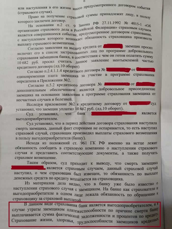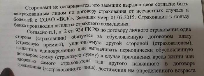 В пятницу получили решение по иску банка. Банк очень хотел получить почти соточку с наследников мужчины, который умер в июле 2015 года. Чтобы пресечь сразу домыслы уведомляю – мы легко отбились по исковой давности. Я хочу написать о другом, а конкретнее о том, как страховкой закрываются кредиты в таких случаях. Итак – суть. Заемщик умер 01.07.2015 года. Кредит был застрахован. Выгодоприобретателем по страховке был банк. Суд указал в решении прямо, что по такому договору страхования претензии по невыплаченному кредиту решаются между страховой и банком, которые уже подбивают остаток суммы и страховая закрывает данный кредит в ноль. И, следовательно, претензий к наследникам в таком случае быть не может, так как кредит закрывается полностью и по наследству не переходит, а банк просто хотел поиметь денежку, не имея на то права в данном случае. Так что, уважаемые читатели, перед тем как платить банку в такой ситуации, ознакомьтесь с договором страхования.