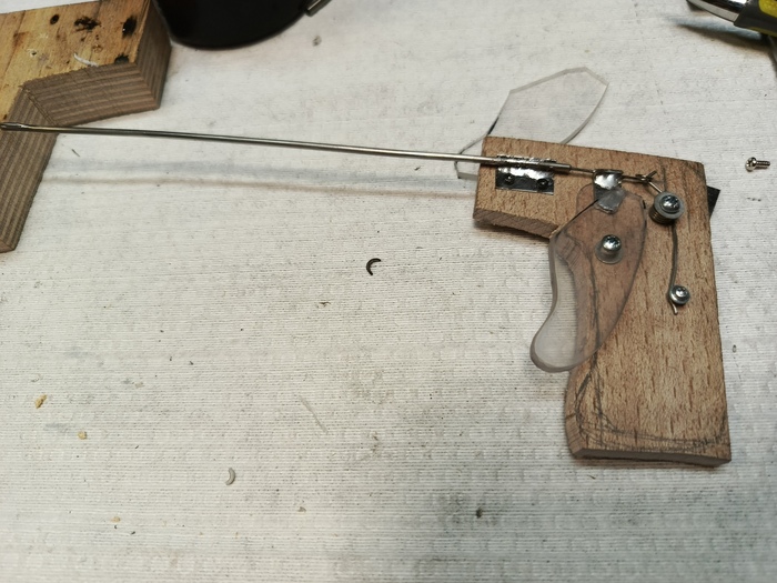 Собрал открывающийся крючок. Трубка с какого-то оборудования, тяга из поводковой струны. Корпус бук. В деле не пробовал. Модель уже под колпаком, а новая ещё не в той фазе. Чувствую что прикольный девайс.