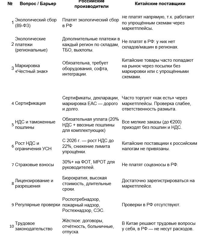 Российские производители сталкиваются с целым комплексом налоговых, регуляторных и бюрократических барьеров, тогда как китайские поставщики работают через маркетплейсы в гораздо более мягких условиях: без НДС, без социальных взносов, без проверок, с поддержкой со стороны государства и маркетплейсов. Это создаёт серьёзный дисбаланс и объясняет, почему российским предпринимателям всё сложнее конкурировать на внутреннем (а где им еще сейчас работать???) рынке.