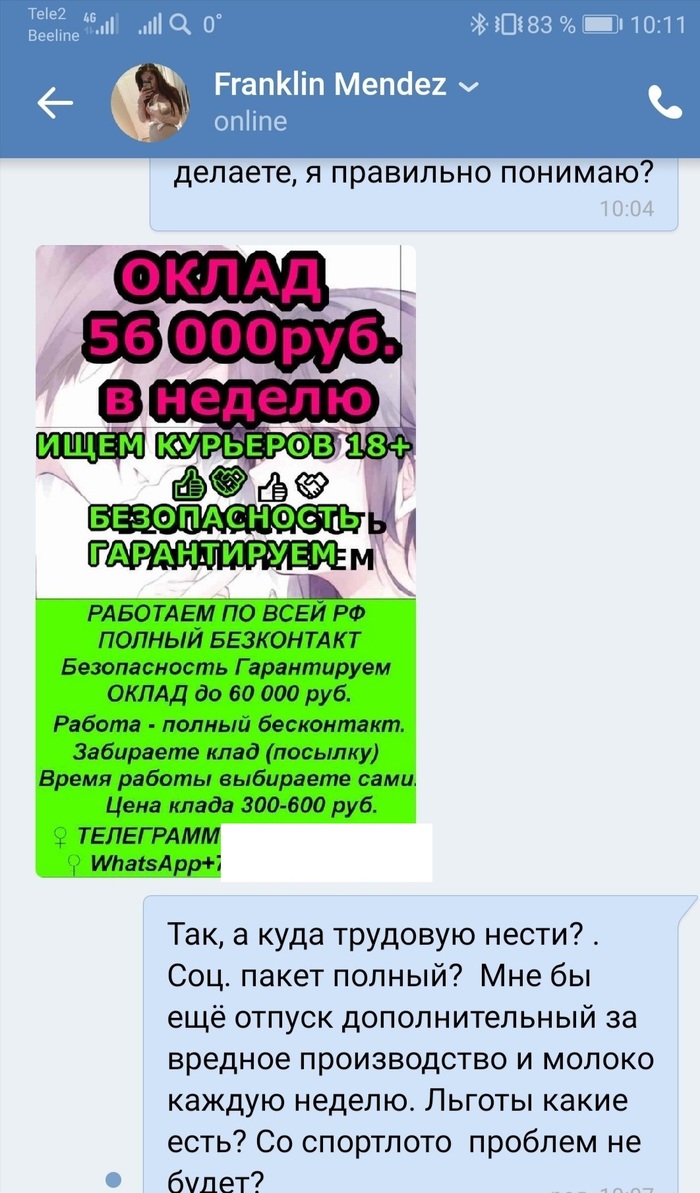 8 Pivtos Как я условия труда узнавал 5 лет назад Сегодня неожиданно написала некая барышня (но это не точно). Но она(снова не точно) оказалась не разговорчивой и условия труда я так и не узнал. Показать полностью 2 [моё] Работа Собеседование Длиннопост Мошенничество Ещё 0