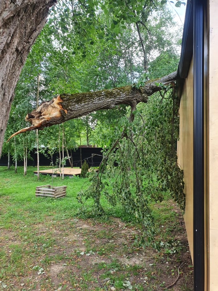 Строили дом в Подмосковье, и рядом с домом росло дерево и одна ветка была на домом. Заказчик не захотел ее убрать. Строили так. Все построили и сдали. Заказчик дом продал. Люди себе жили и когда был ураган в Москве ветка не выдержала и упала прямо на верхнее остекление. В итоге заменили два стекла. Дом в целости. Продолжают жить