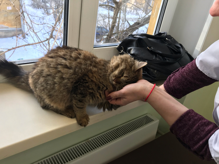 Киса вновь пришла в наш кабинет и уже уверенно направилась на подоконник к сумке моей медсестры))