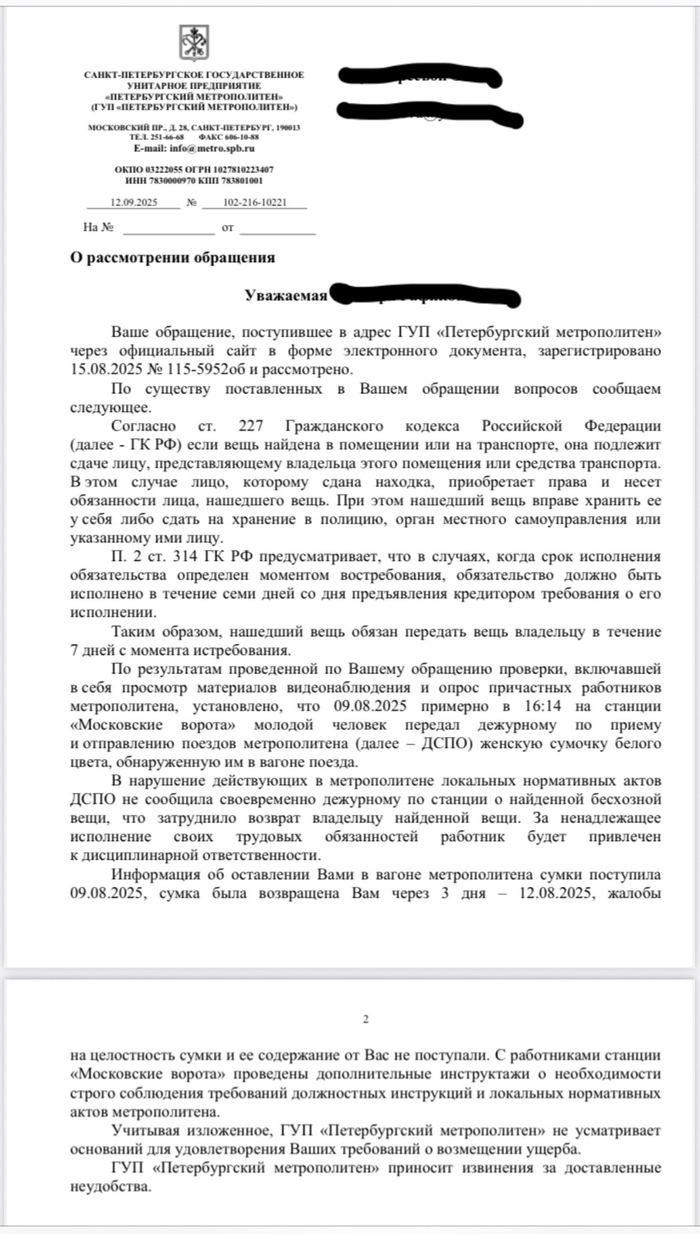 Мы написали официальную жалобу в Петербургский метрополитен. В ответе они признали, что их сотрудница нарушила инструкции: «не сообщила своевременно дежурному по станции о найденной бесхозной вещи, что затруднило возврат». Её даже пообещали «привлечь к дисциплинарной ответственности». Но! В возмещении 17 000 рублей за замену замка отказали. Мотивировали это тем, что сумку вернули, а жалоб на её содержимое не было. То есть то, что мы не могли попасть домой и были вынуждены нести расходы из-за их сотрудницы, их не волнует.