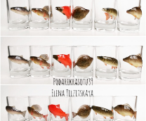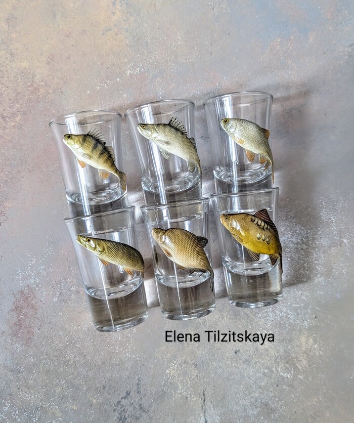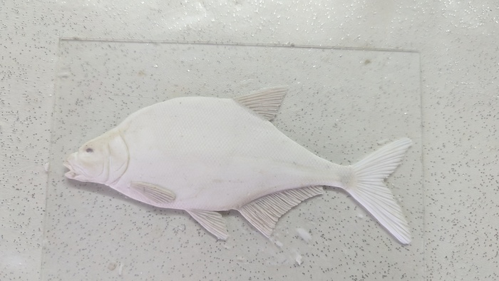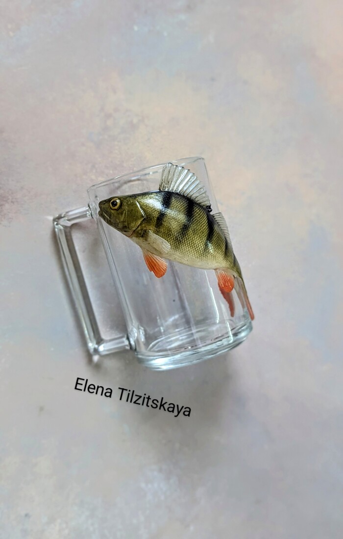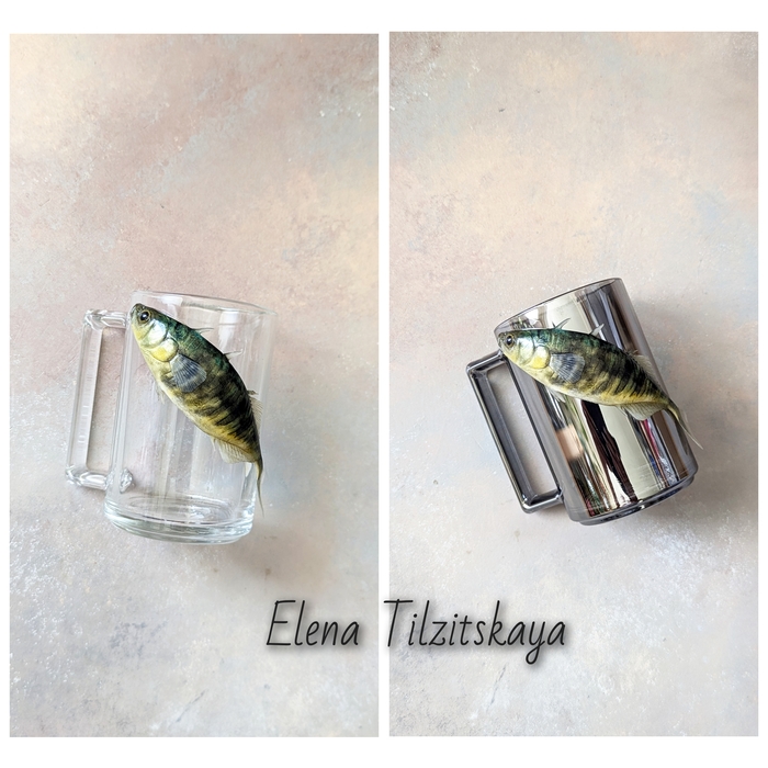 Рыбу леплю из белой полимерной глины на кружке (рабочей), тонирую сухой пастелью, запекаю, покрываю лаком.