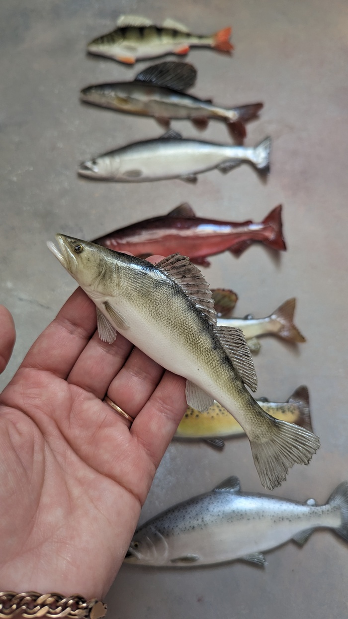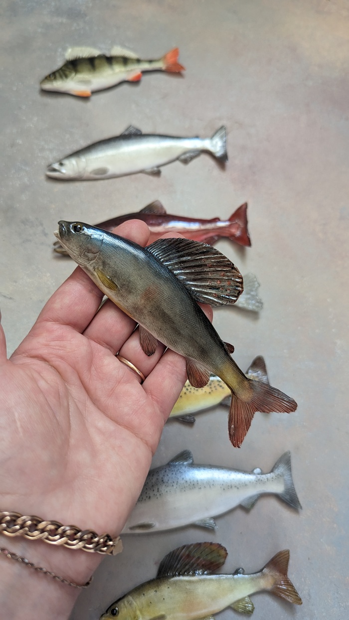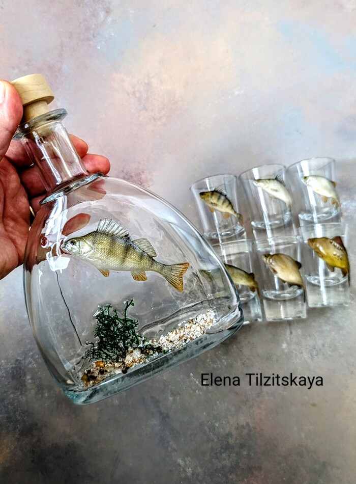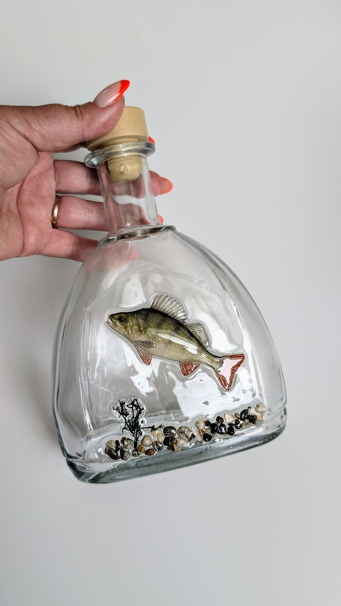 Окунь из полимерной глины, натуральная галька, мох, залита эпоксидкой.