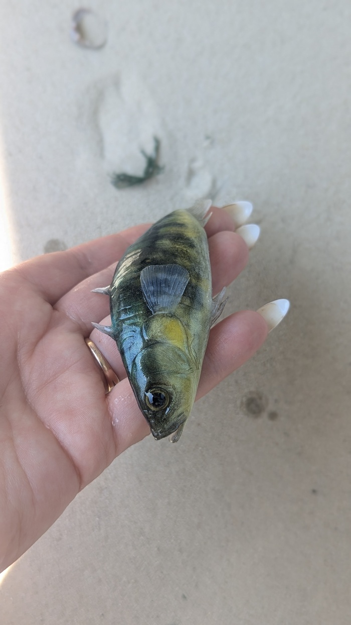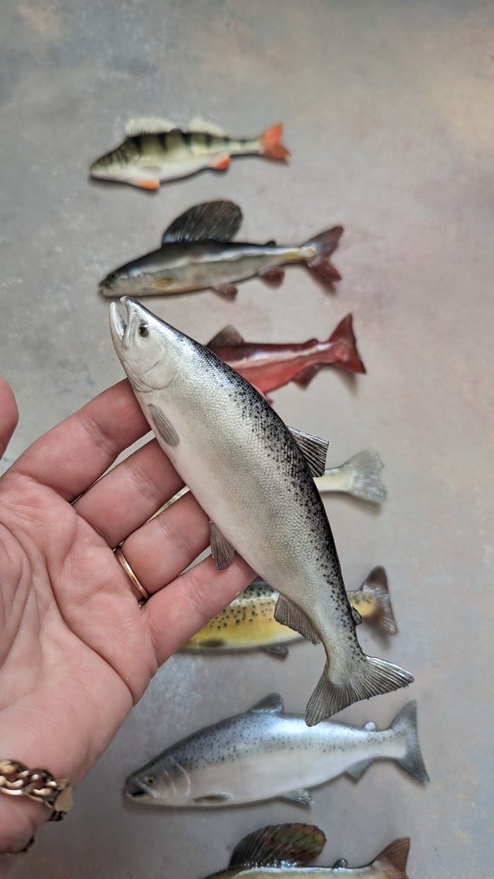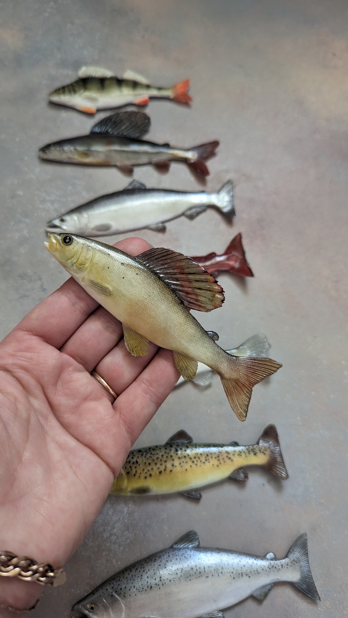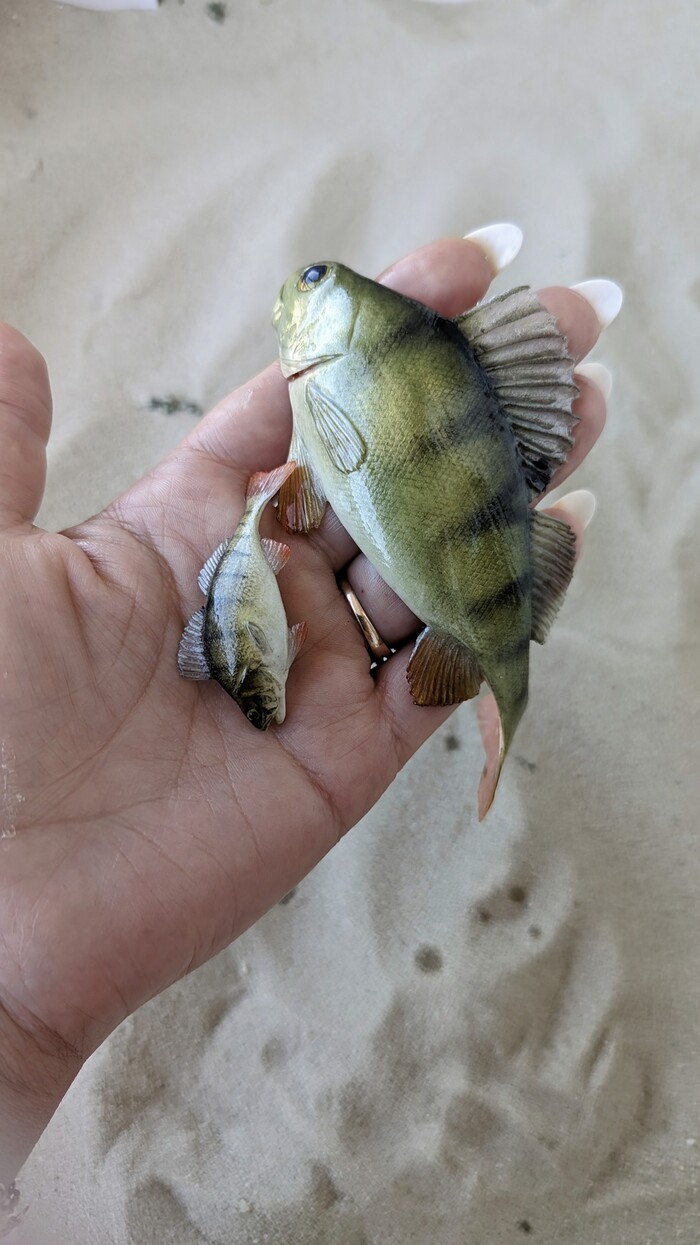 Окунь из полимерной глины, натуральная галька, мох, залита эпоксидкой.