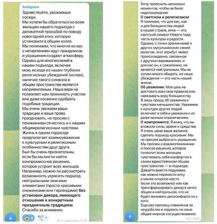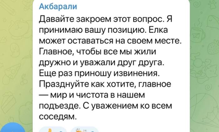 "Давайте закроем этот вопрос. Я принимаю вашу позицию. Главное, чтобы все мы жили дружно и уважали друг друга. Ещё раз приношу извинения. Празднуйте как хотите, главное — мир и чистота в нашем подъезде. С уважением ко всем соседям."