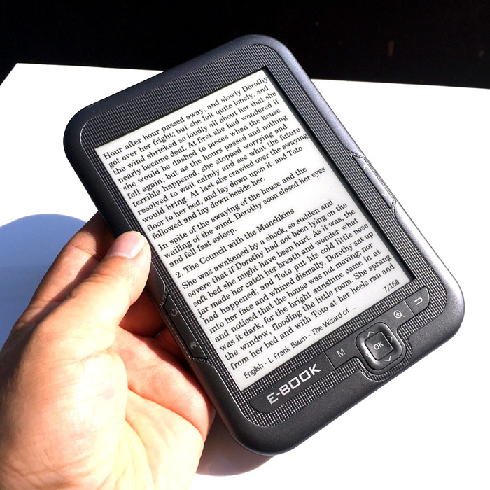 Дисплей: Исключительная особенность «Читалок», это электронные чернила или электронная бумага, E-Ink. Дисплей выглядит как лист бумаги с напечатанным на нем текстом. Подробнее можно прочитать тут: Электронная бумага. На сегодняшний день существует уже третье поколение таких дисплеев. Они уже цветные и имеют подсветку.