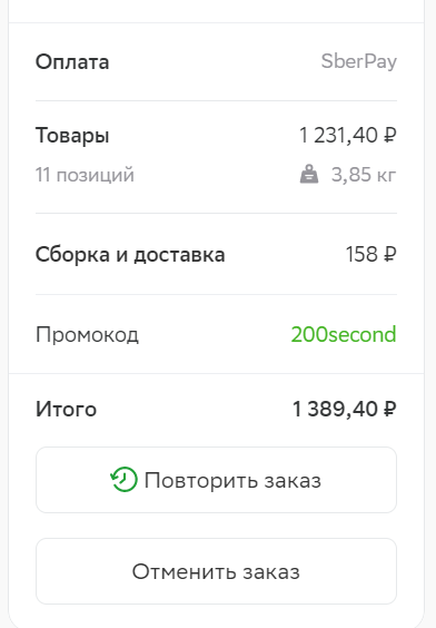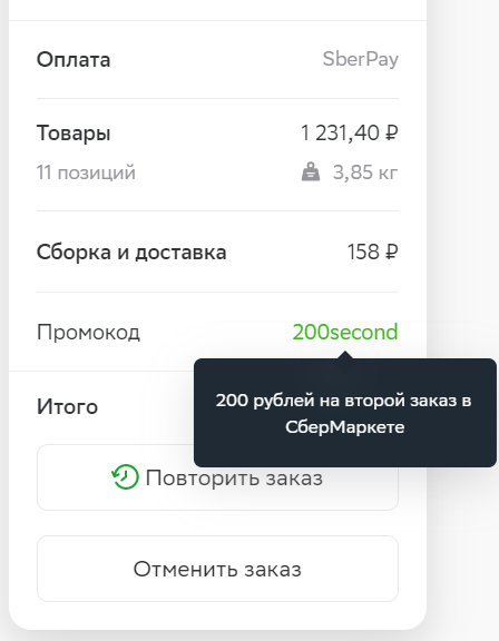 Решил я сделать заказ продуктов через один известный сервис "СберМаркет" от известного банка, а на электронную почту они мне ни так давно прислали промокод "Скидка 200руб на второй заказ". Набрал корзину, вбил промокод, сумма уменьшилась на 200руб, вроде выгодно, выбрал оплату через sberpay, жду.