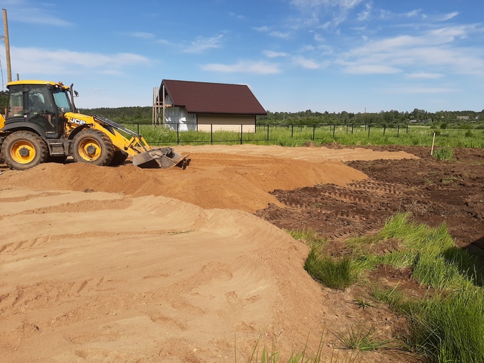 Заказал экскаватор и 200 кубов песка. Купил виброплиту на авито. Убрал плодородный грунт с половины участка. Отсыпал и утрамбовал песком. Отправил письма на установку свай. Выбрал самого адекватного и недорогого подрядчика.