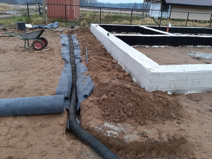 Вокруг фундамента откопал канаву и заложил 100мм трубу дренажа, обсыпав щебнем и обернув геотекстилем. Установил 2 смотровых колодца.
