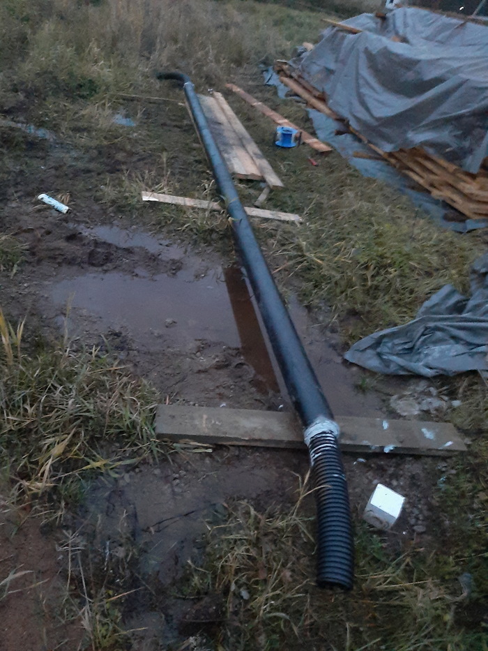 Закопал трубы канализации и ввода воды. Для ввода воды использовал ПНД трубу 50мм для внешней оболочки и 32мм для воды