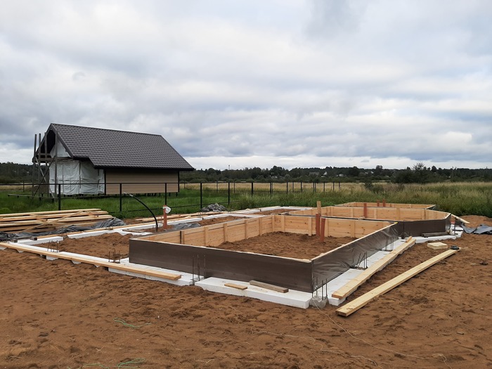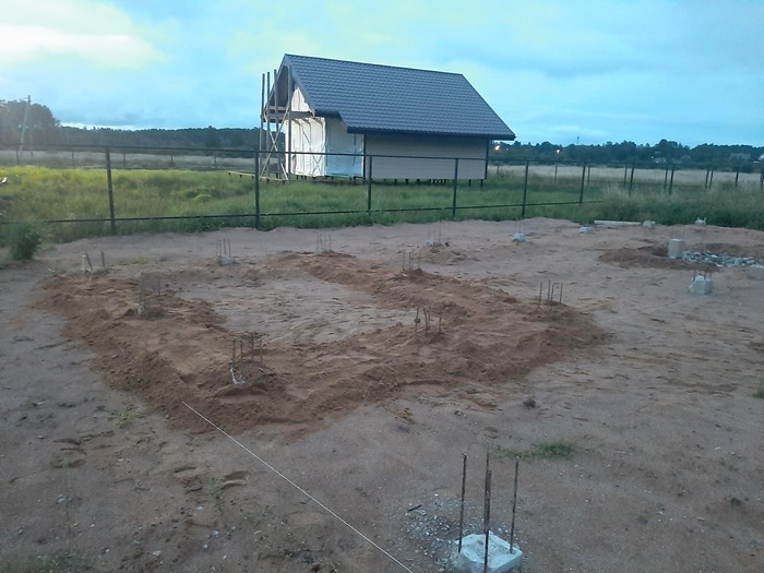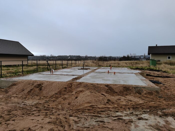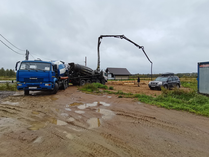 Выстелил подложку будущего ростверка в уровень. Потом заказал арматуру и дерево. По выходным, за три месяца, собрал опалубку и арматурный каркас. В сентябре заказал 23 куба бетона М300 с бетононасосом и залил ростверк.