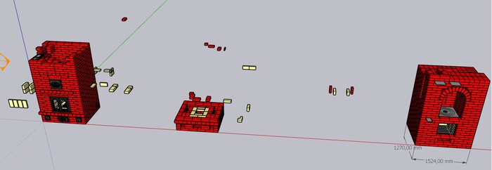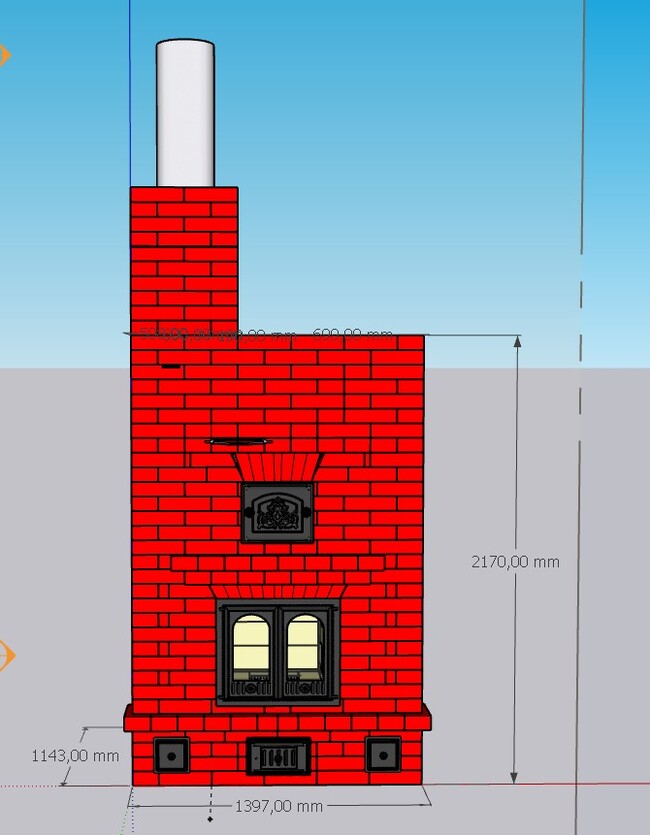 Для построения решил применить двухколпаковую схему. В процессе рисования смотрел имеющиеся в продаже компоненты, такие как дверцы, задвижки, шамотные кирпичи и плиты, брал их размеры, отрисовывал или находил в библиотеках похожее. Соответственно размер печи менялся несколько раз.