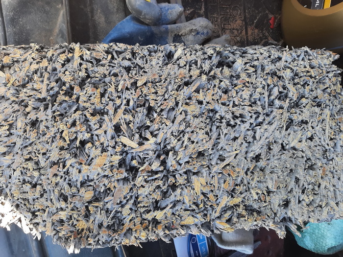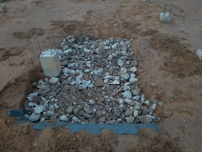 Прикинул вес печи . Три тонны. Опирать такой вес на ростверк не захотел. Посоветовавшись с коллегами родили такое решение. На этапе разметки опалубки ростверка разметил прямоугольник 3х2м, под местом установки печи, убрал песок, выстелил геотекстилем, утрамбовал вибролитой, отсыпал 20см крупными камнями, бетоном от оголовков свай, утрамбовал, отсыпал чутка щебня 20х40, утрамбовал.