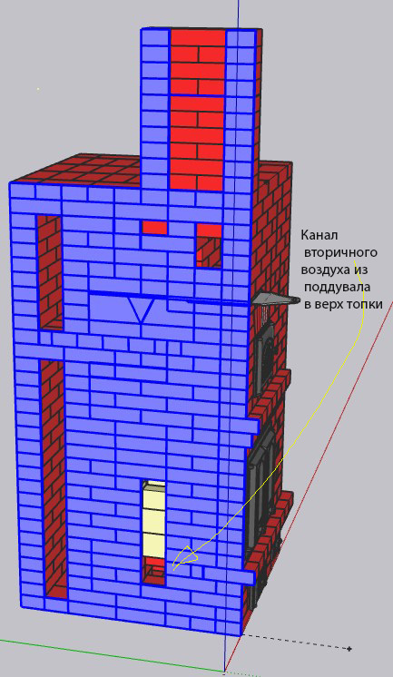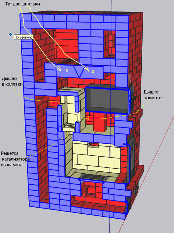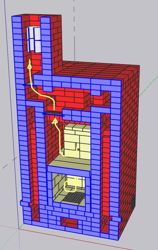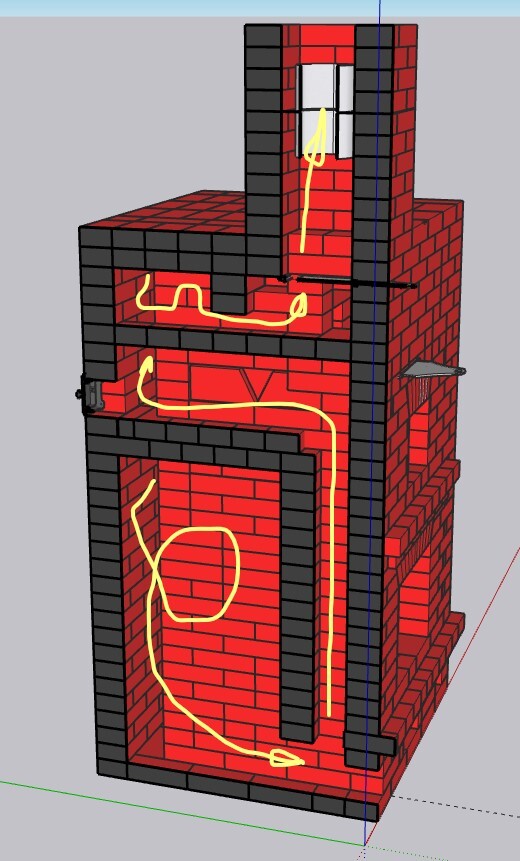 Все эти скечапные художества я закинул на форумхаус, и началось... Кто то писал "такое не надо строить", кто-то в личку писал "Круто , как додумался". Один добрый человек выдал 11 замечаний, из них актуальных 4 , остальные недоработки рисунка. По замечаниям, переделал вывод дышла в заднюю стенку, будет добавлена регулировка подачи вторичного воздуха, и добавлено прекрытие забора воздуха с улицы, ну и дырку в кладке предусмотрю, чтобы в режиме обогрева часть газов к хлебной камере попадала, небольшую, в четверть кирпича. Но это все на этапе сборки. А может и трубу по центру печи выведу, от армопояса над печью отказался.