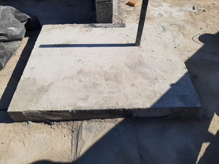 На этапе заливки ростверка, огородил досками два короба и залил из остатка бетона две плиты рядом с ростверком. из плит выведена аматура для заливки вертикальных стоек. Потом построил опалубку, купил бетономешалку и залил вертикальные стойки.
