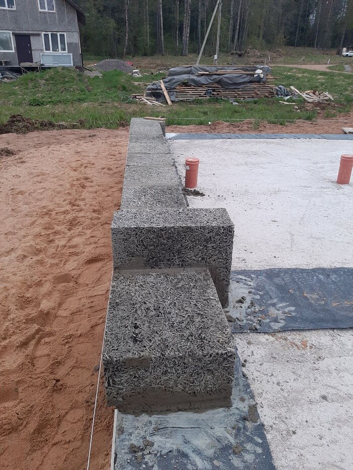 Сьездил на другой обьект из арболита. Да у меня вообще кладка идеальная, почти. У профи, из дружественных нам южных стран, швы по сантиметру, у меня один-три миллиметра. У них верх кладки волной , у меня визуально ровно.