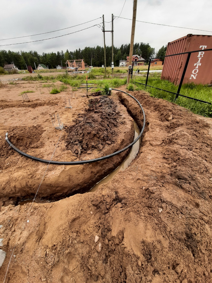 Пришла весна, я допилил план дома. Рассчитал теплопотери и армокаркас фундамента. Купил бэушную бытовку. Столб с электрощитком был через дорогу. Заказал установку столба на участке. Перекинул через дорогу провод СИП, установил щиток и провел кабель питания в бытовку в траншее.