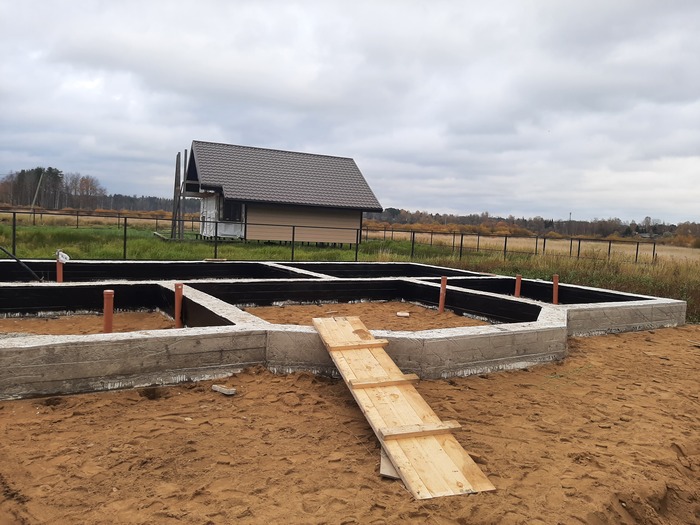 Пришла весна, растаял снег. Пока поставщик алхимичил мне первую партию блоков, я нарезал стеклоизол и наплавил на ростверк гидроизоляцию.