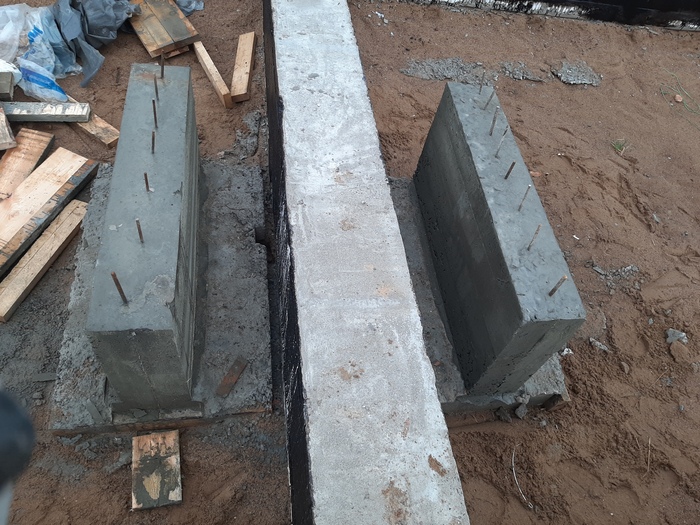Первую неделю, ездил каждый вечер, набирал воду из святого источника, проливал бетон. Через три недели разобрал опалубку. Ростверк промазал изнутри битумным праймером, потом резинобитумной мастикой.