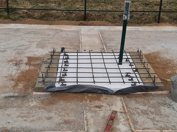 После обратной засыпки ростверка и отливки подбетонки, набил песком и утрамбовал кувалдой промежутки у печной плиты, постелил поверх ростверка пленку, следом пенопласт 50мм в размер плиты, построил опалубку, связал сетку из арматуры 10мм и отлил плиту. Бетон стоек мешал М200, плиты М300.