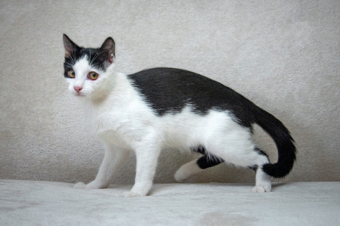 Он одет, как и подобает джентльмену: белая сорочка и черный фрак. А сколько грации в этом очаровательном юноше. Он молод (5 месяцев), здоров и до безумия очарователен. Кай - настоящий джентльмен с душою ребенка. Как только мальчик попадает в руки – начинает тарахтеть и петь песенки, хоть на руках дольше 30 секунд пока не сидит, но всё время приходит ласкаться. Легко сходится с другими котами, любит побегать, поиграть. При смене обстановки может немного застесняться. Лоток на отлично, кушает сухой и влажный корм. Пока не привит, к когтеточке не приучен. Отдается ответственным людям, строго без самовыгула, с условием обязательной кастрации по возрасту. Приезжайте на смотрины!