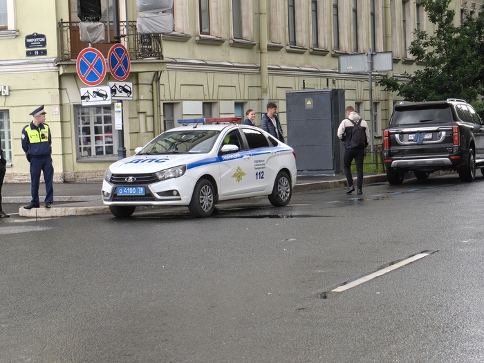 Переходил университетскую набережную. 4я линия ВО. Проявил гражданскую позицию и указал сотруднику на нарушение. Он ничего не сказал. Говорил рядомстоящий мужчина. Парковка платная, денег нет. У сотрудников ФСО. А они первых лиц охраняют. Значит все норм. Это почти дословно.