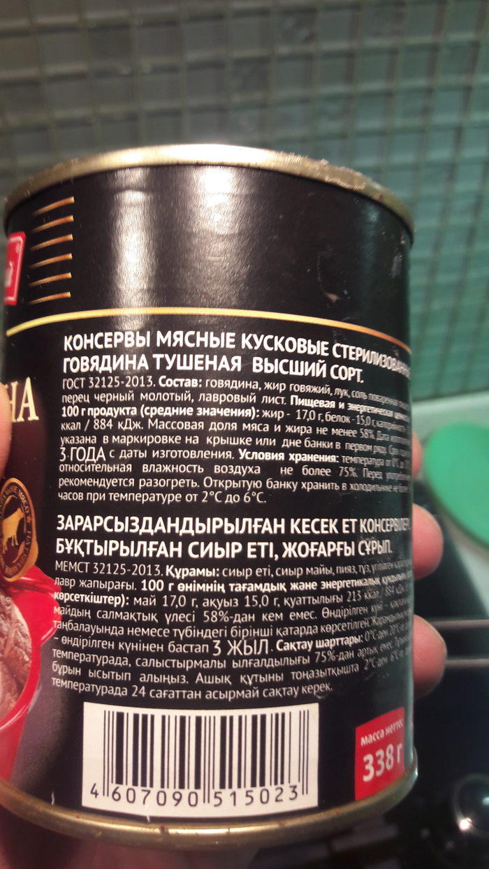 И что видим, говядина тушёная высший сорт от 56 до 59%. Простая арифметика и во первых наебали на 42 грамма, во вторых, если заявлено 338 грамм, а мы видим 88 грамм, то это 26% вместо ГОСТовских 56-59%.