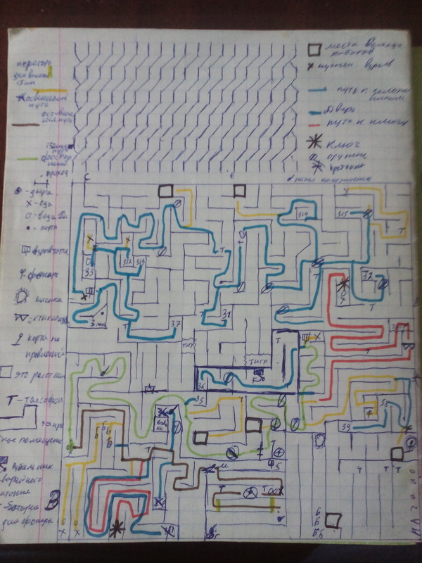 Северное направление мы прошли за 3.5 минуты. На восток двигались 9.5 минут. Если верить часам 40ч. 37 минут, это время, которое у нас осталось. На север мы шли 1.5 минуты. Потом мы поели и пошли дальше, но весь западный проход просто двигался от змей, их было больше 10000, они были ядовиты и очень опасны. Длина коридора 400 метров, на другой стороне две метки, а на нашей вверху блоки и веревка 550 метров и сиденья для нас. Попав в цели, мы смогли бы перебраться, но чтобы додуматься до этого нам потребовалось 30,5 минут. Мы, проделав проверочные выстрелы, привязав веревки, выстрелили в метки. Нам надо было торопиться, ведь у нас осталось 40 ч 05 минут. На середине мы застряли и так мы висели, пока не додумались. Распустив шелковые куртки, сделали еще по выстрелу, и начали подтягивать себя. За 2 часа мы, кое-как, добрались до конца, но там опять ловушка два заряда со снотворным на 30часов 30 минут! После сна у нас осталось времени 9 ч 35 минут. Пройдя северный проход за 2 минуты, мы добрались до таксофона. «В западном проходе есть вода и еда». – Вода! Мы чуть не сошли с ума! За 13 минут мы добрались до воды. Там было 20 литров в нательных жилетах. Мы напились и наконец, поели хлеба и рожков, которые были тут. Звонок из таксофона « В лабиринт спускаются роботы и 15 заложников. Роботы появятся через 5 часов. Вы должны найти заложников и ракетометы с бронежилетами. За это получите вторую часть карты. Заложники это ваши подруги!» -Пип-пип-пип…