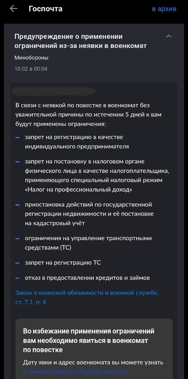 Тут приходит уведомление о применении ограничений в связи с неявкой.