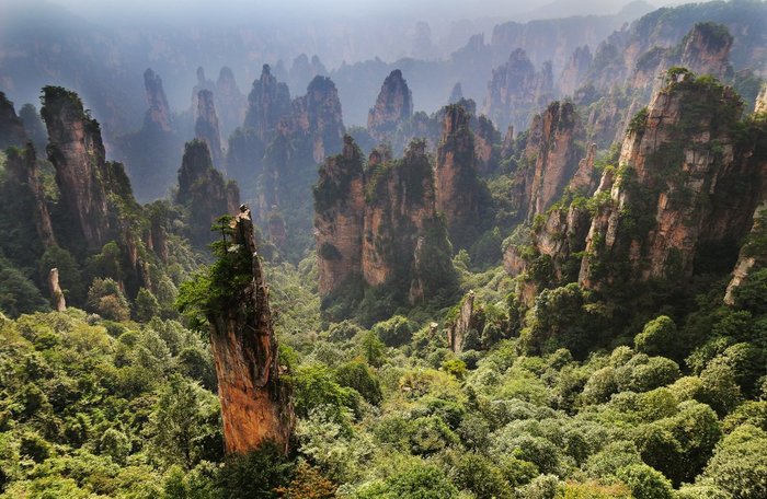 Место, ставшее прототипом инопланетных пейзажей фильма «Аватар», – парк в регионе Хунань «Чжанцзяцзе». Трехкилометровые скалы, поросшие вековыми лесами, вздымаются высоко в небо. Среди этих диких красот можно встретить множество видов животного мира.