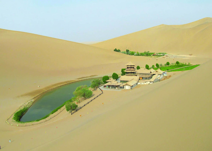 Среди песчаных дюн пустыни Гоби, как неожиданный мираж, появляется озеро Юэяцюань – природный оазис, расположившийся возле озера, по форме напоминающим полумесяц. Там в тени садовых деревьев спрятался храм, построенный в традиционном китайском стиле.