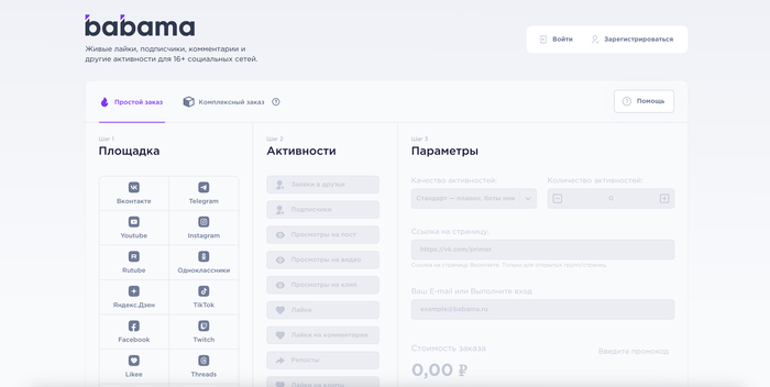 🥈 babama.ru — сервис, предлагающий накрутку лайков, подписчиков и других активностей для более чем 10 социальных сетей, включая ВКонтакте, Telegram, YouTube и TikTok. Пользователи могут выбрать между экономными ботами и качественными живыми аккаунтами.